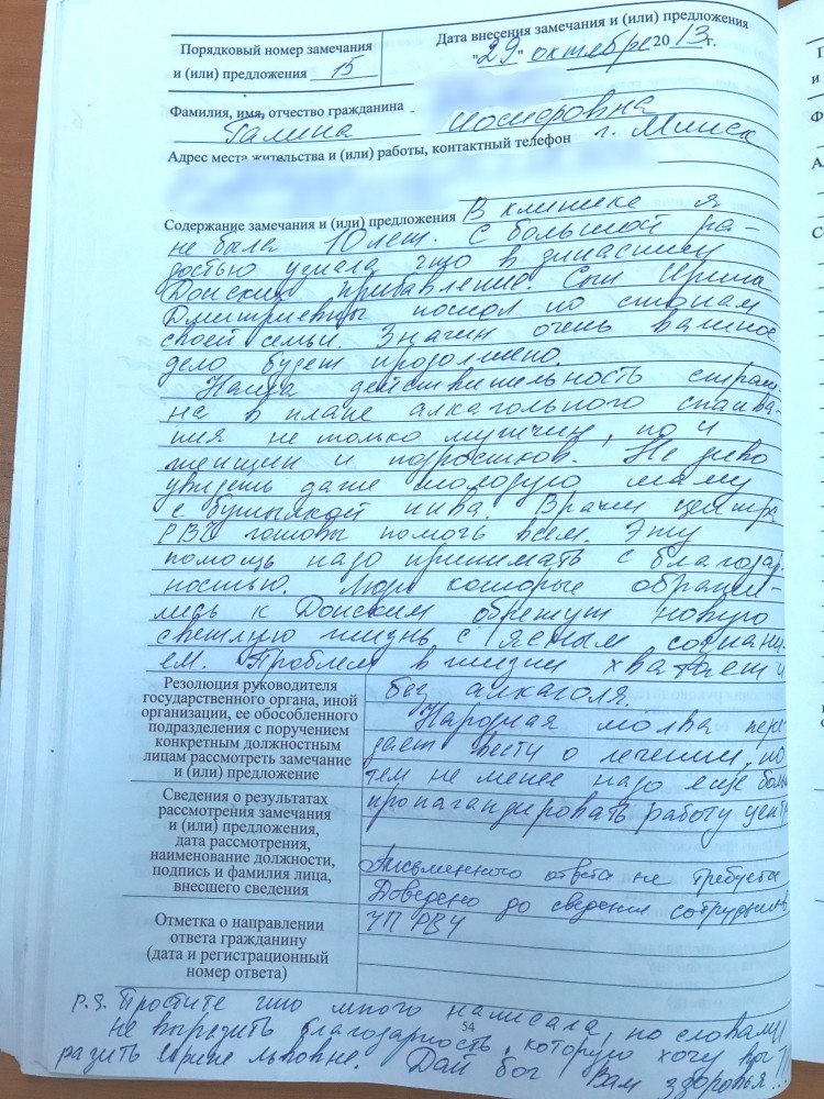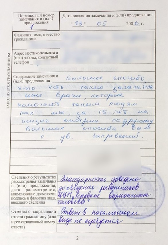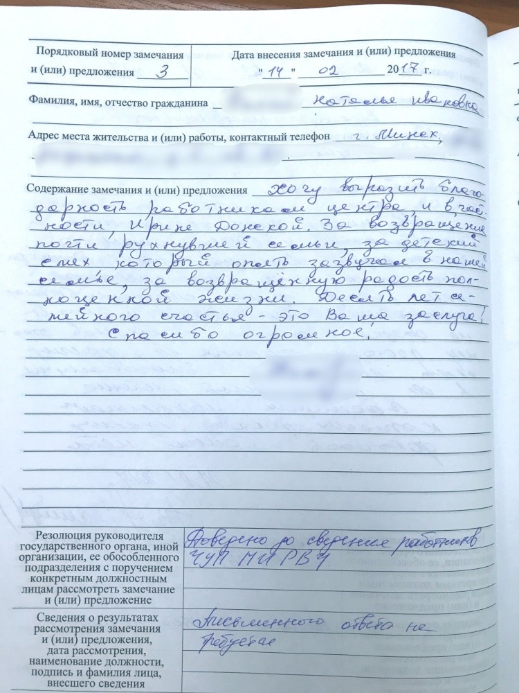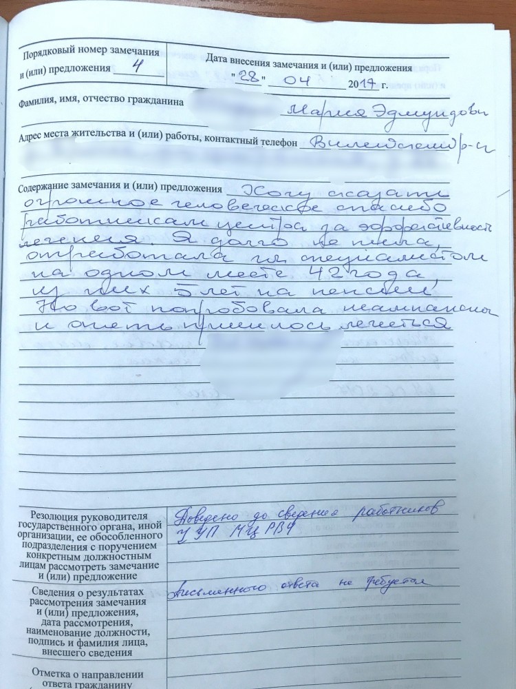 Спасибо ей за сострадание и помощь людям, за человеческий подход. Дай бог счастья, здоровья и дальнейших успехов в нелегком труде».