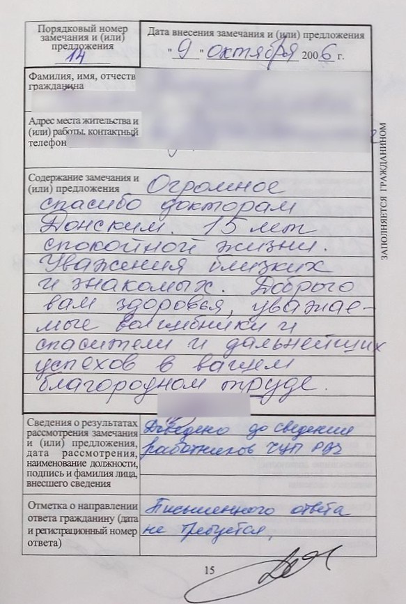 "Огромное спасибо докторам Донским. 15 лет спокойной жизни. Уважения близких и знакомых. Доброго вам здоровья, уважаемые волшебники и спасители и дальнейших успехов в вашем благородном труде."