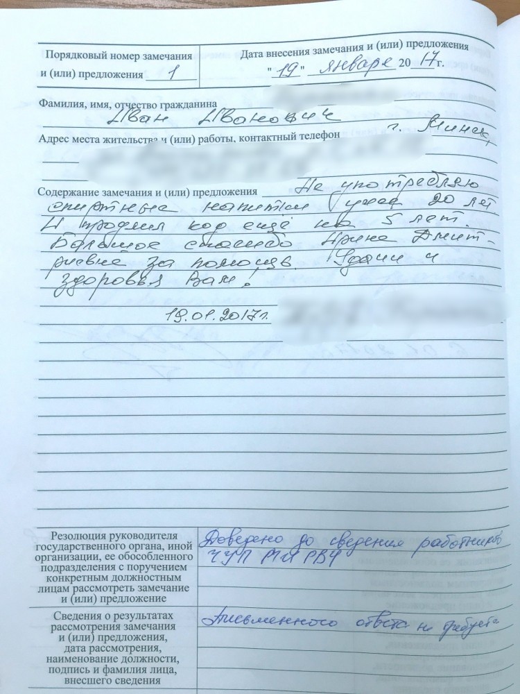 «Спасибо огромное моей спасительнице – Ирине Дмитриевне Донской. Первый раз закодировался в 1990 году на 10 лет. Даже в голову не приходила мысль о выпивке все эти годы. В 2000 г. продлил код еще на 10 лет и сегодня – опять на 10 лет.