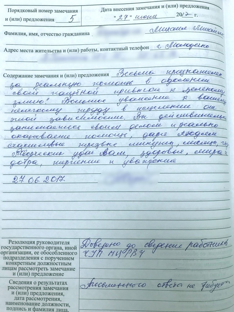 "Выражаю самую искреннюю благодарность за нужную помощь людям в их тяжолом положении. Вы и Ваша работа возвращаете людей к жизни, даёте ещё один шанс стать людьми. Желаю Вам дальнейшего процветания и огромного здоровья, успехов в Вашем труде."