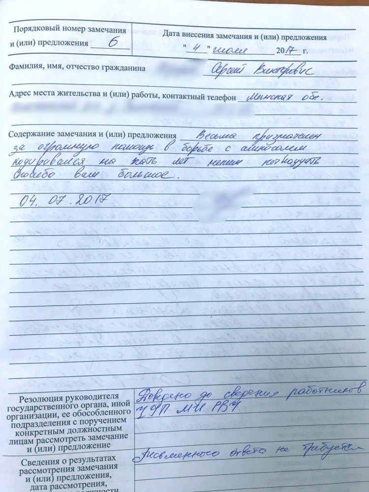 "Весьма признателен за огромную помощь в борьбе с алкоголизмом.